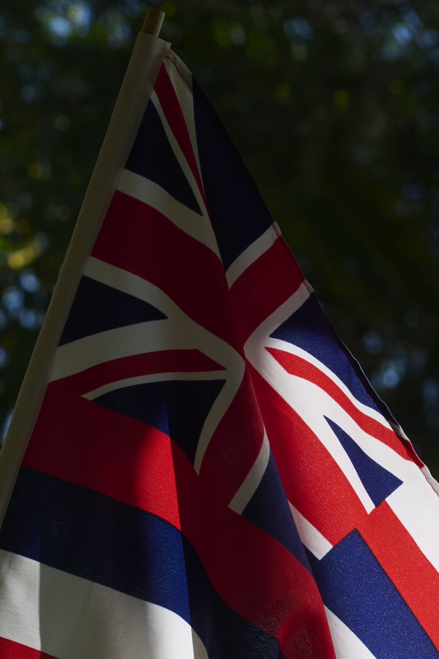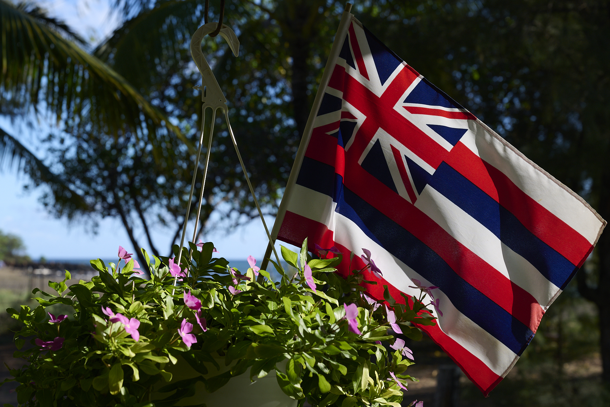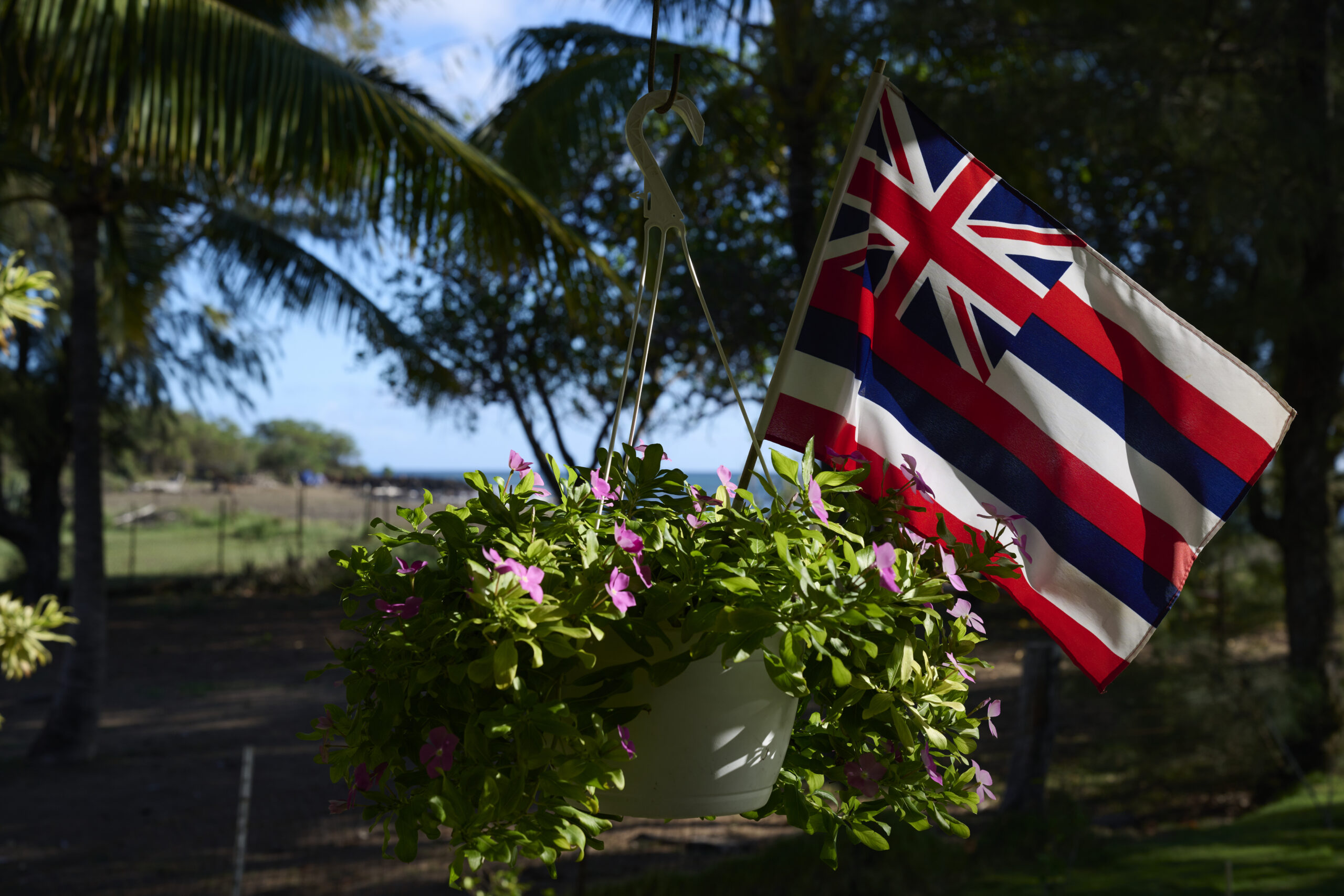 We have flower baskets on our Lāna‘i. The baskets have our State Flag planted in them. The light on the flowers and the flag are an enjoyable observation for me. I would capture the image from 10 feet in distance.