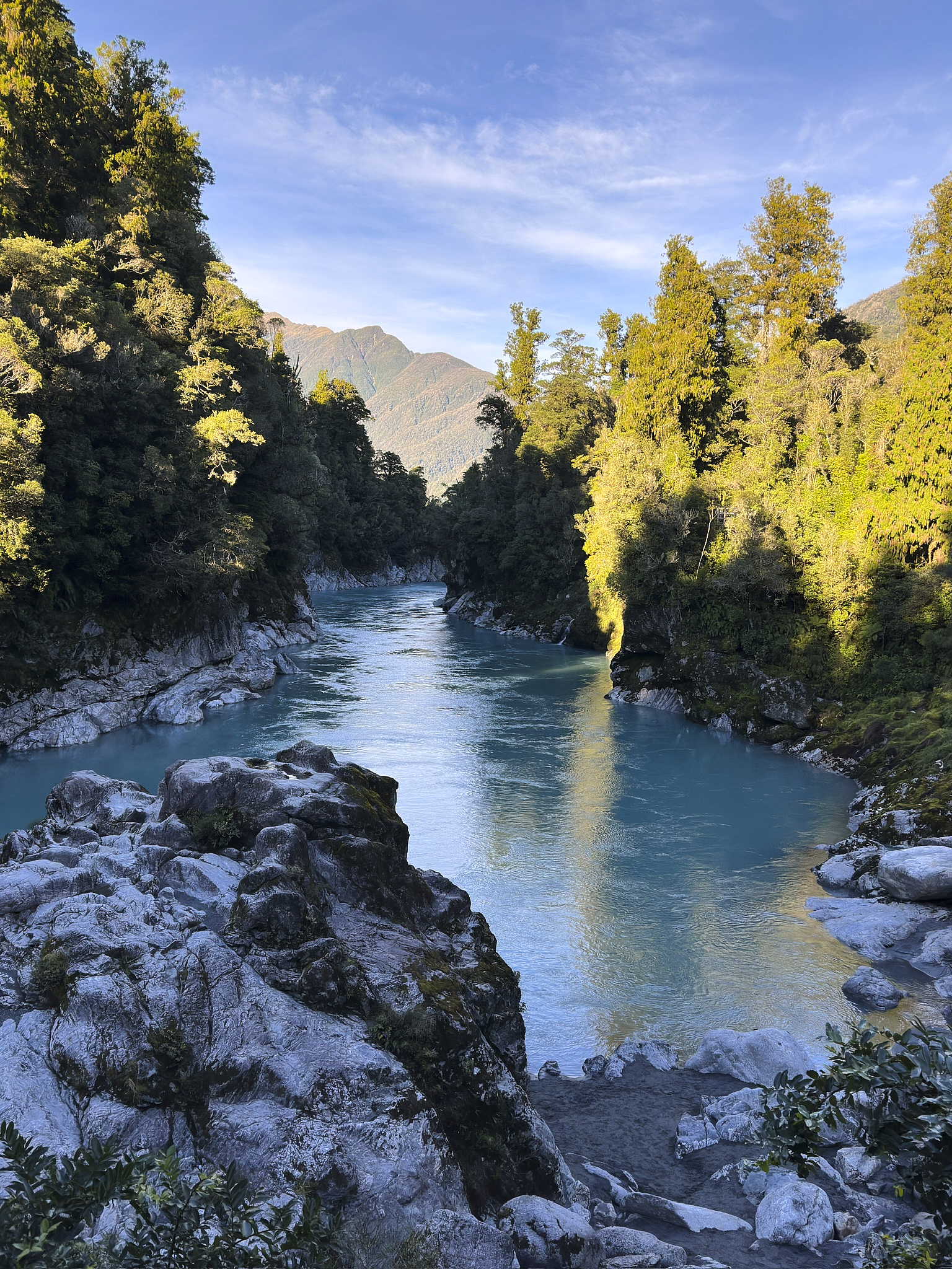 The Hokitika Gorge from dawn through early morning is what locals will tell you is the prize.