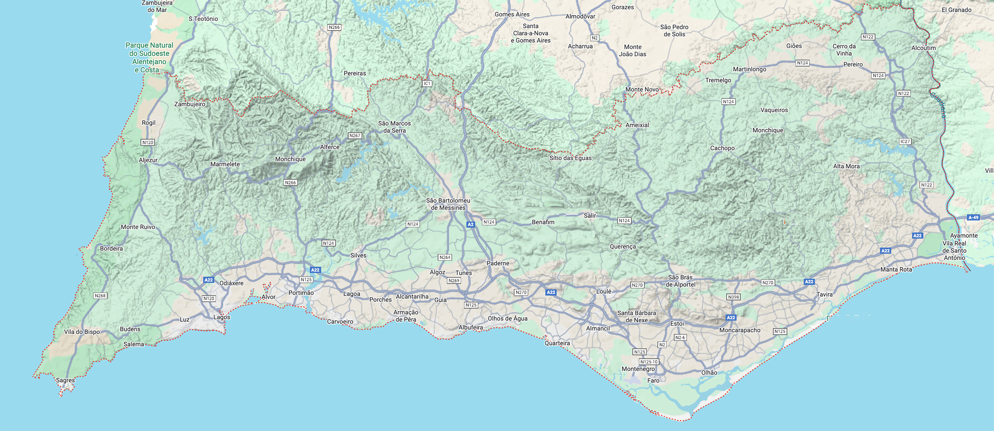 The Algarve is in southern Portugal, on the Atlantic. The coastline extends to the Spanish border. It stretches from Odeceixe in the northwest to Santo Antonio in the southeast.