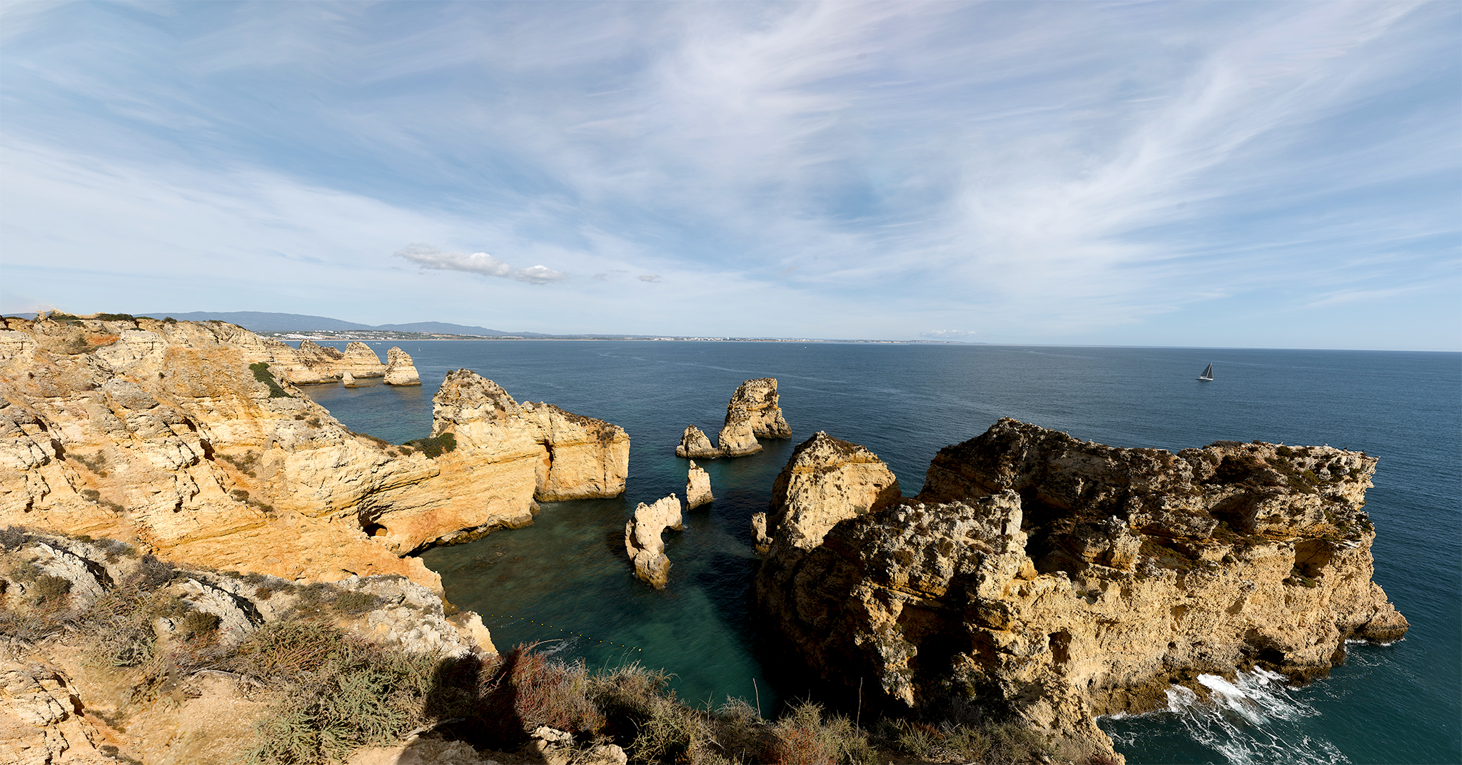 The coastline west toward Luz has what seems like countless sea-caves.